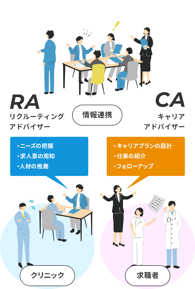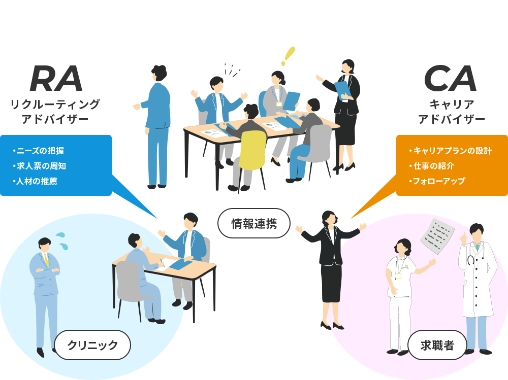 社内求人票やRAとの情報共有で、求職者の課題解決に繋がる最適なクリニックを検討します。